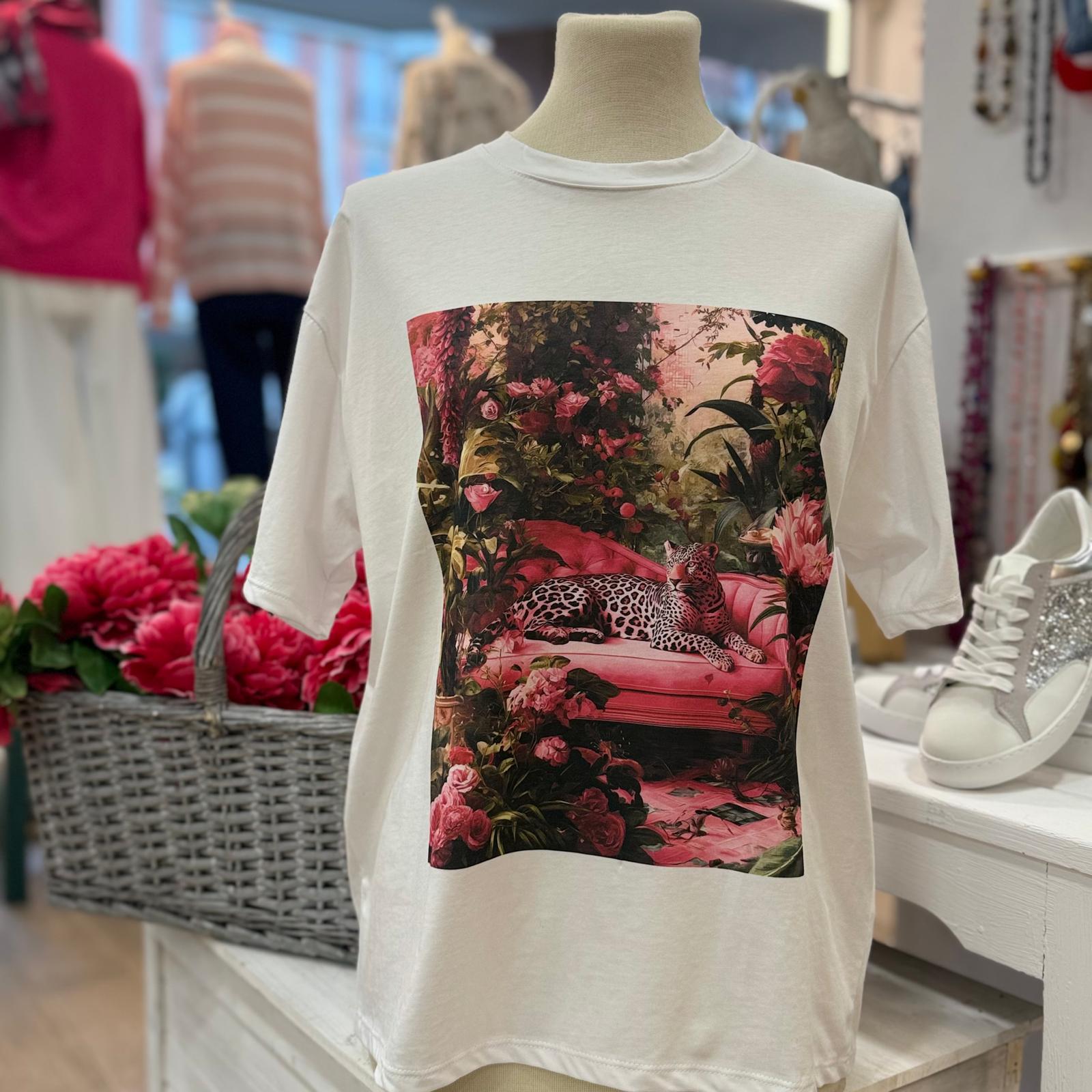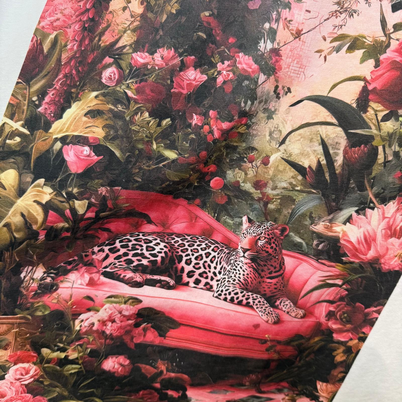 Camiseta de algodón 100%. Tiene un dibujo de una leoparda sentada en un sillón rosa, jugando con tonalidades rosas y fucsias, que hacen de la camiseta una prenda más elegante. Todo rodeado de rosas.