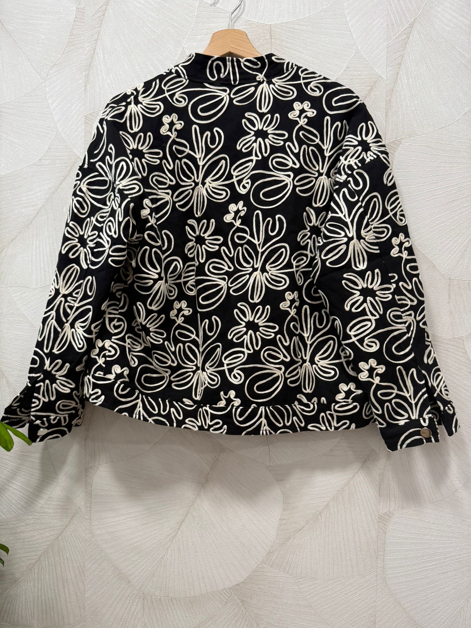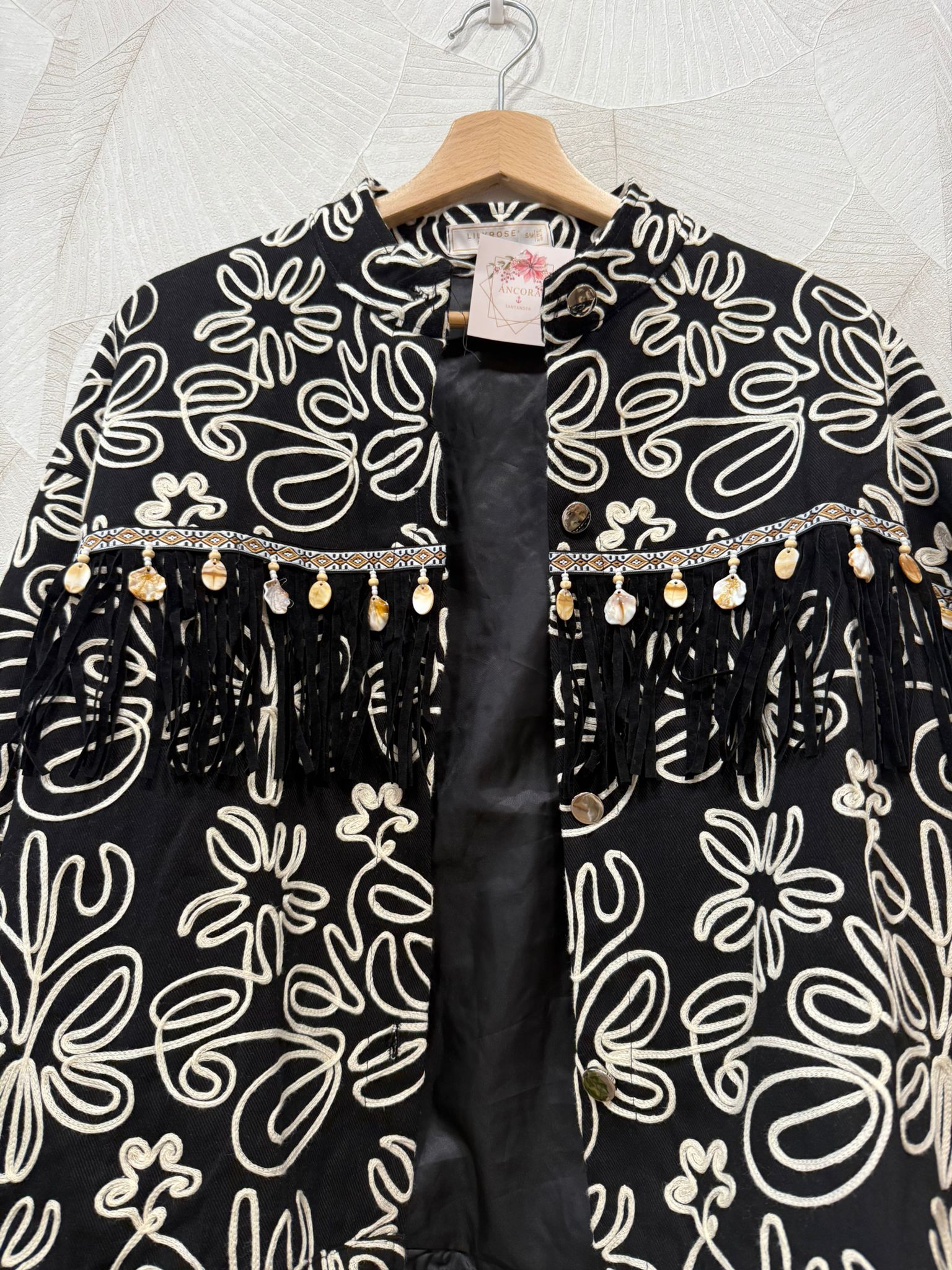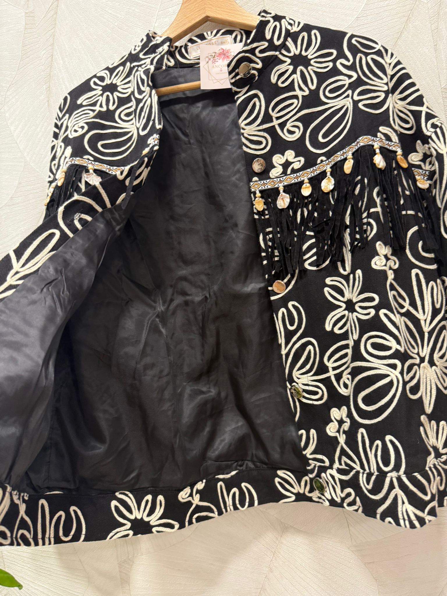 Chaqueta negra con bordados en contraste con beige, llena de detalles artesanales que la hacen única y especial.