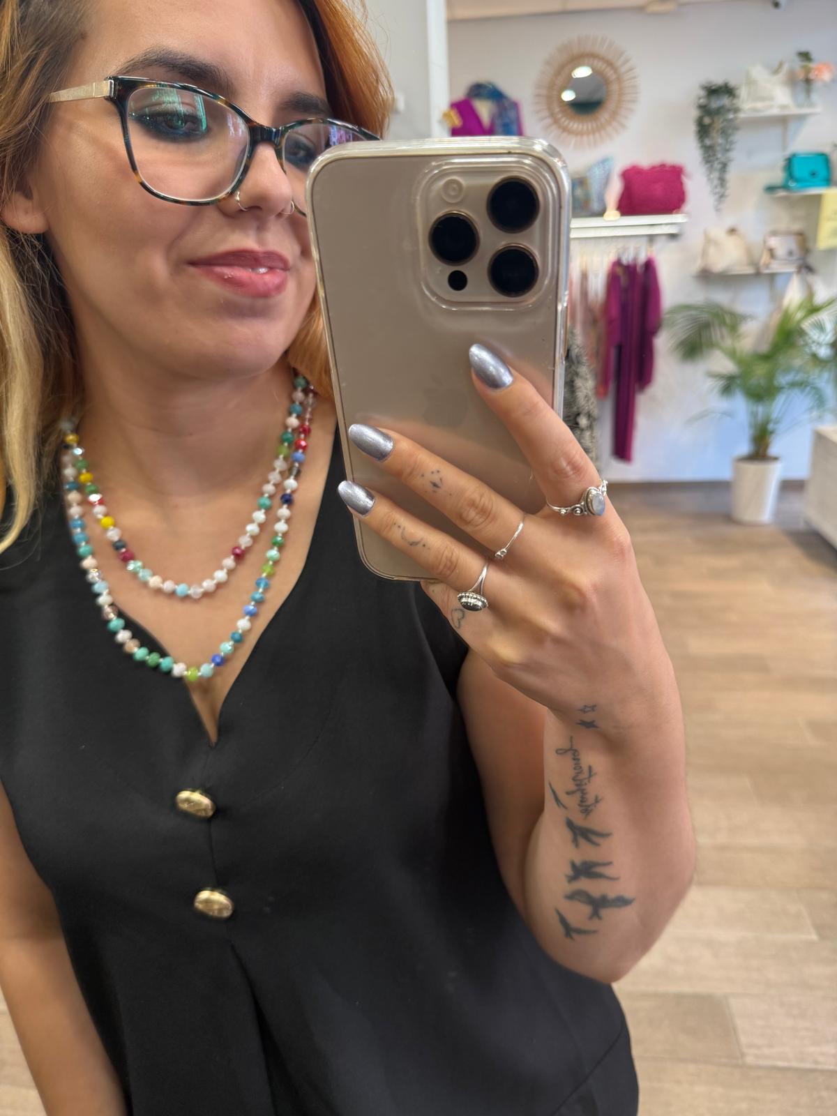 Un diseño lleno de vitalidad y alegría. Este collar está elaborado con abalorios de colores intensos y brillantes, cuidadosamente seleccionados para crear una armonía vibrante que resalta con distinción.