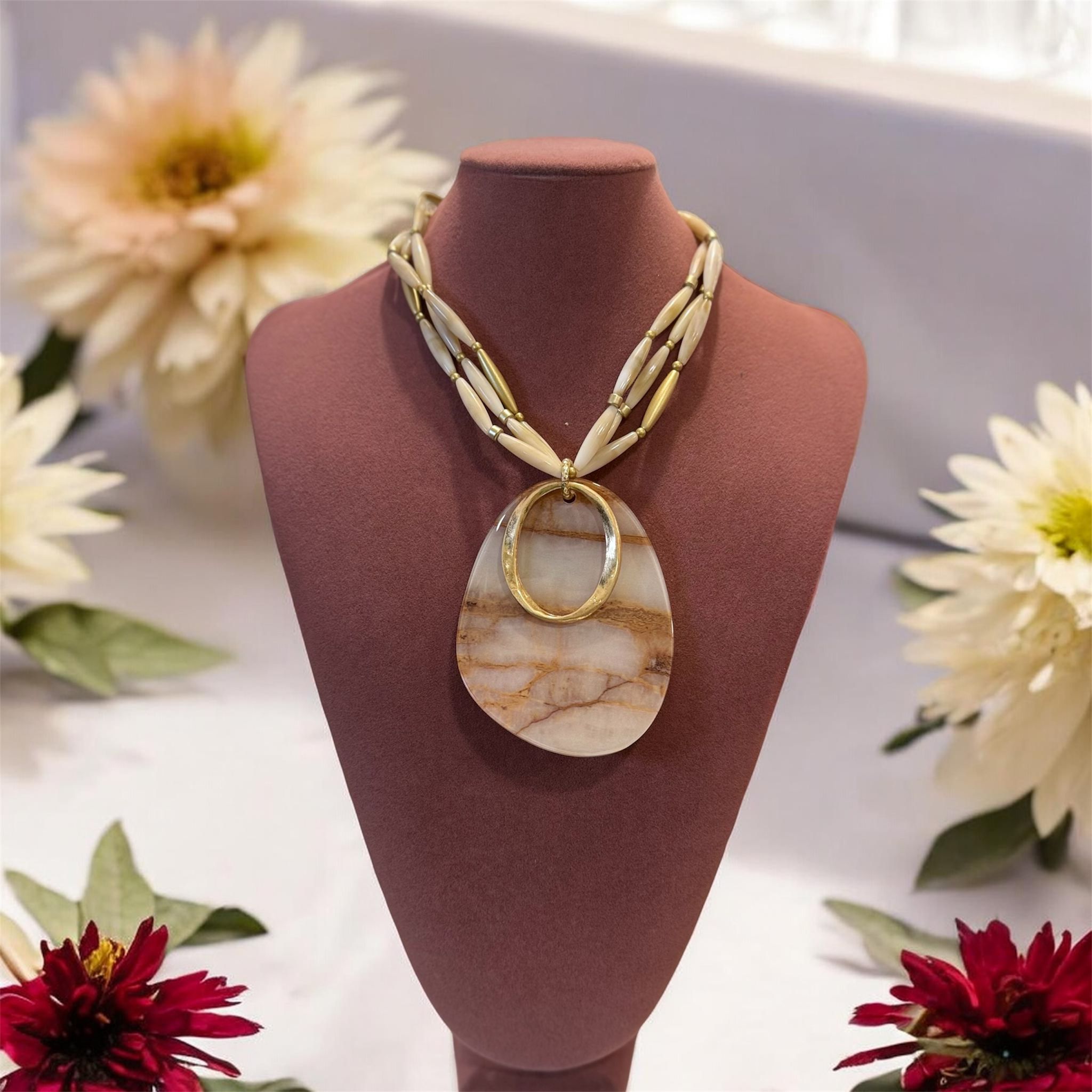 El protagonista de la pieza es su impresionante colgante ovalado, elaborado con una piedra de apariencia marmoleada en tonos crema y vetas cálidas, enmarcado por un aro dorado que realza su belleza orgánica. Cada detalle ha sido cuidadosamente seleccionado para crear una pieza armoniosa que combina lo moderno con lo artesanal.