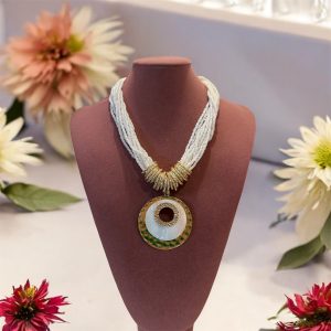 una pieza única que combina elegancia y modernidad. Su diseño de múltiples capas con delicadas cuentas en tonos azules crea un efecto luminoso y dinámico que no pasa desapercibido. Los sutiles detalles dorados aportan un contraste chic, mientras que su pieza central ovalada añade un acabado exclusivo y muy especial.