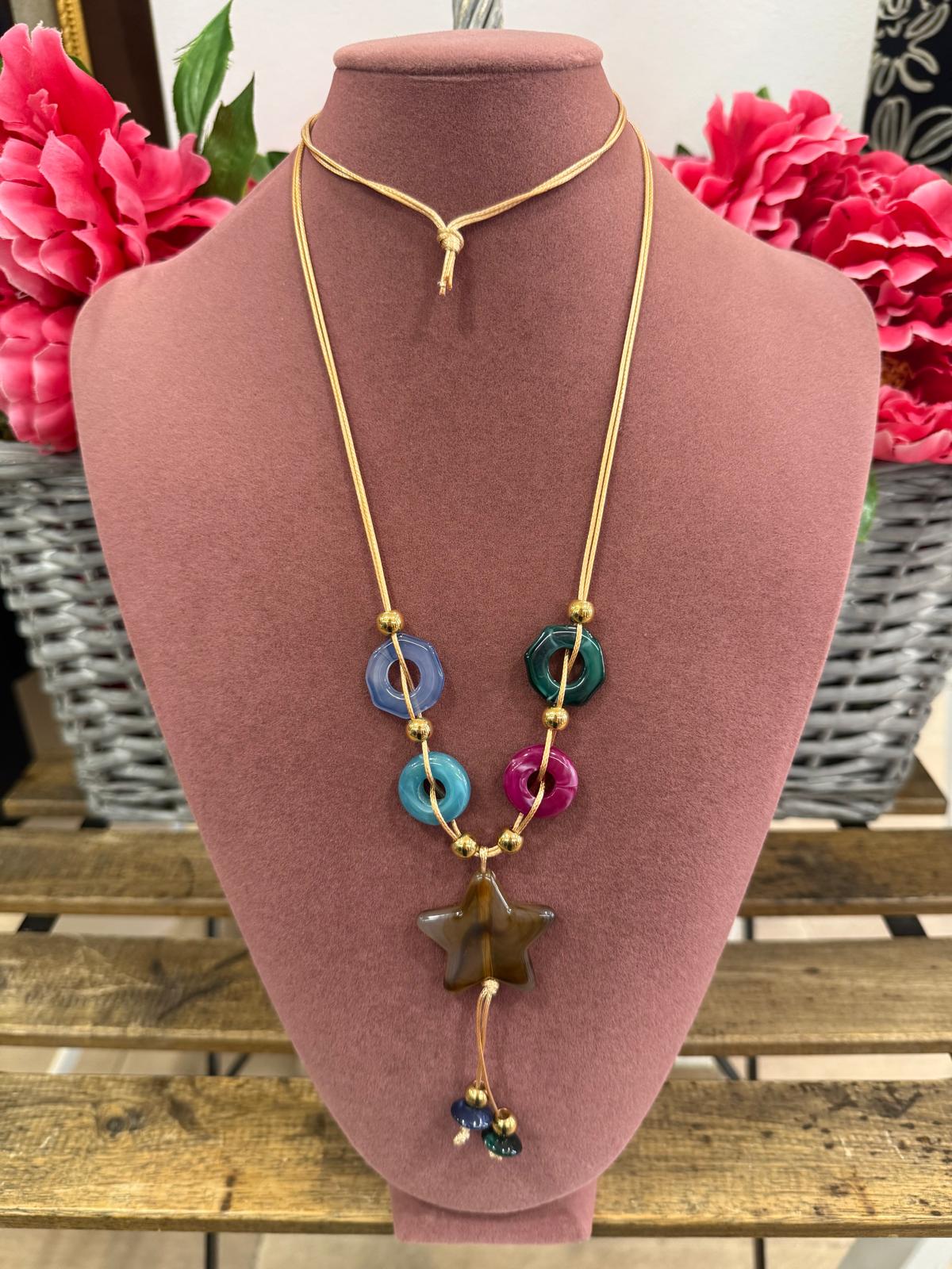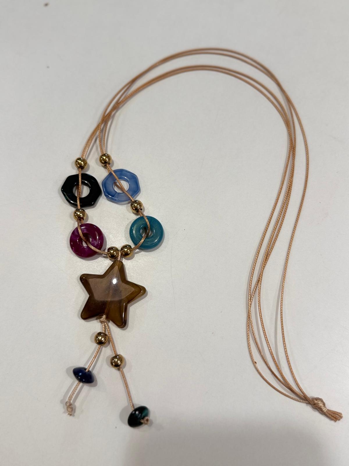 Collar simple de hilo dorado/beige. Marca la diferencia su estrella en color fucsia.