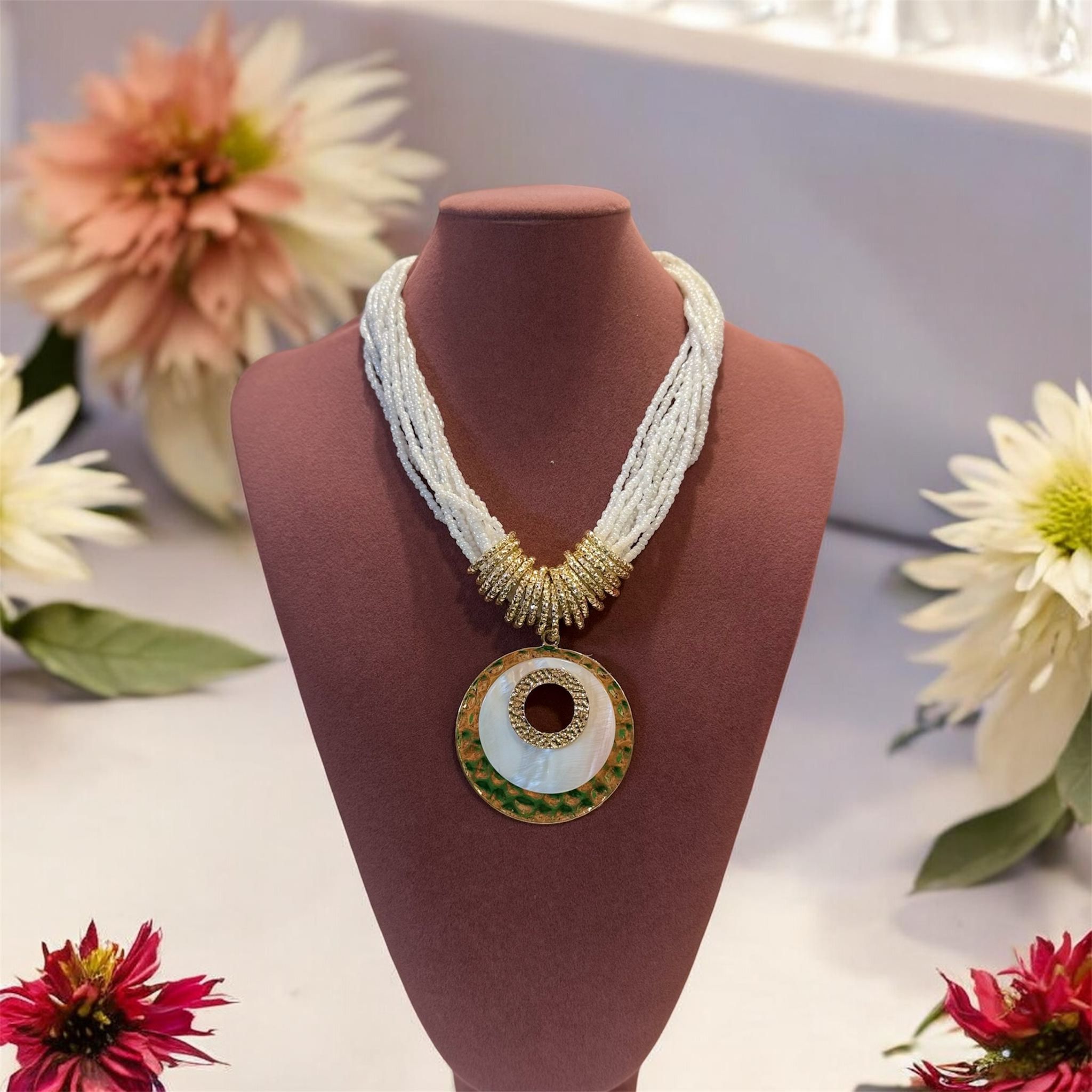 Este deslumbrante collar combina elegancia clásica con un toque contemporáneo, convirtiéndose en una pieza protagonista para cualquier ocasión especial. Está elaborado con múltiples hileras de delicadas cuentas blancas que aportan textura, luminosidad y sofisticación al diseño.