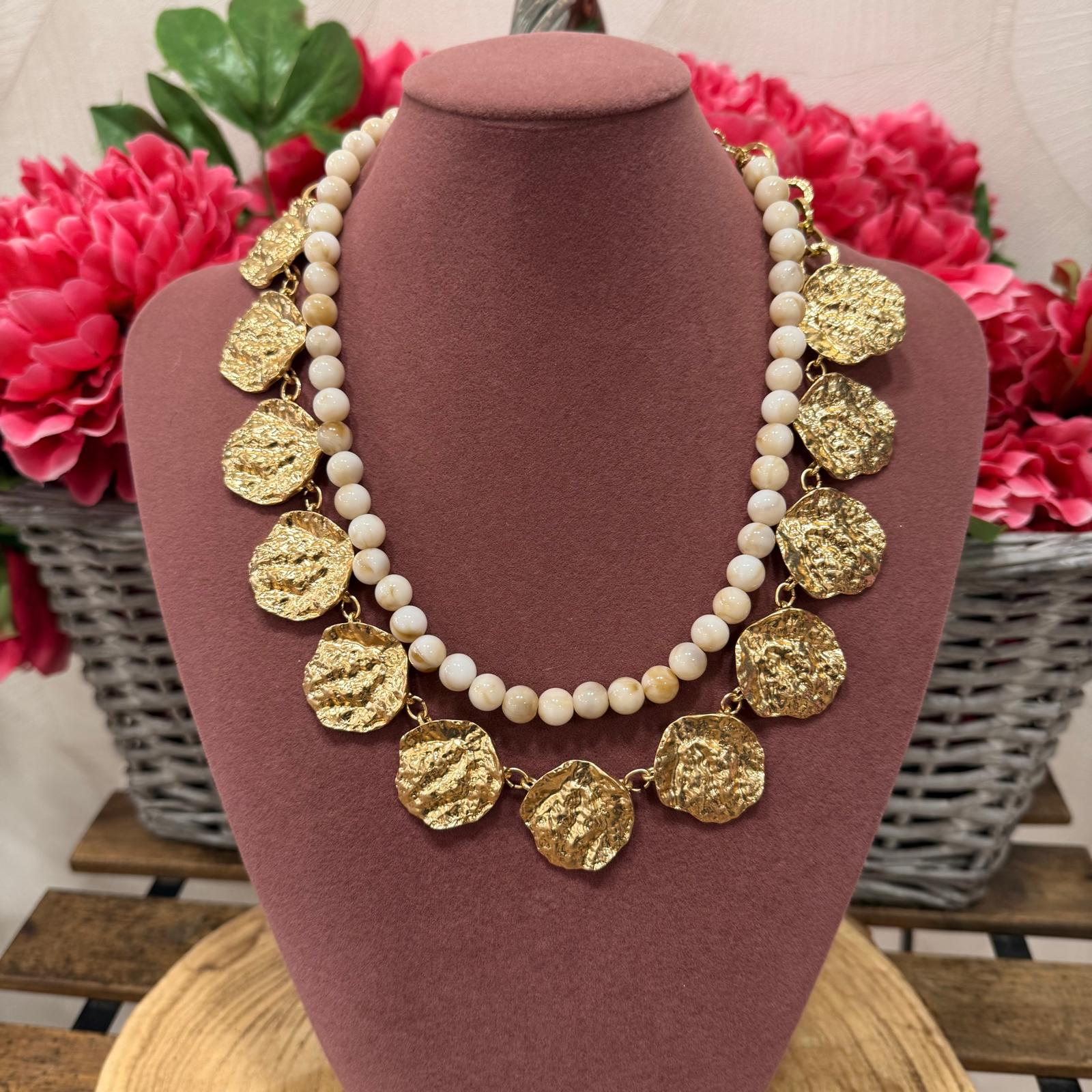 Collar de perlas blancas y marrones combinado con chapas doradas.
