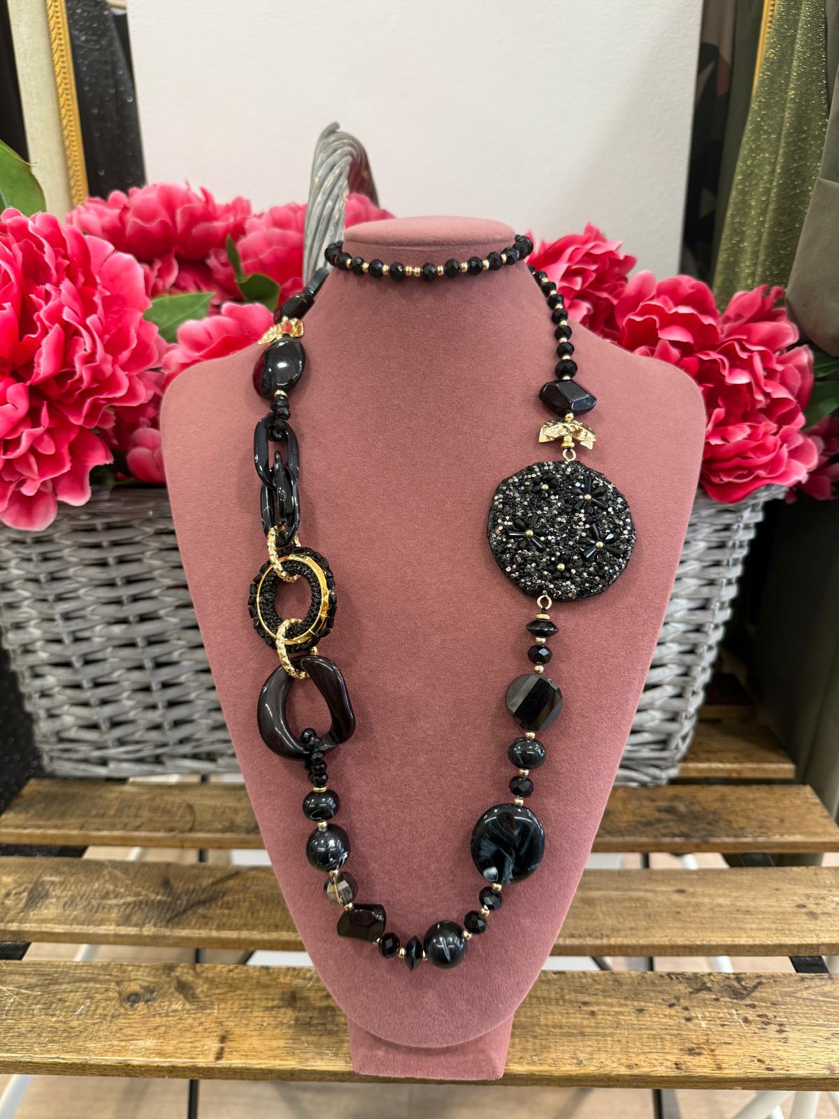 Collar de abalorios negros. Consigue un efecto irregular por la piedra efecto glitter unida al resto de abalorios.