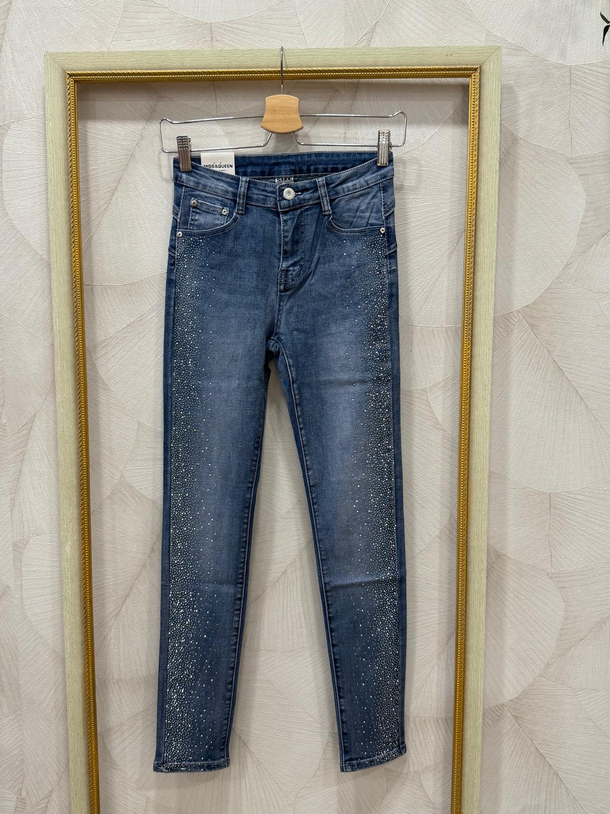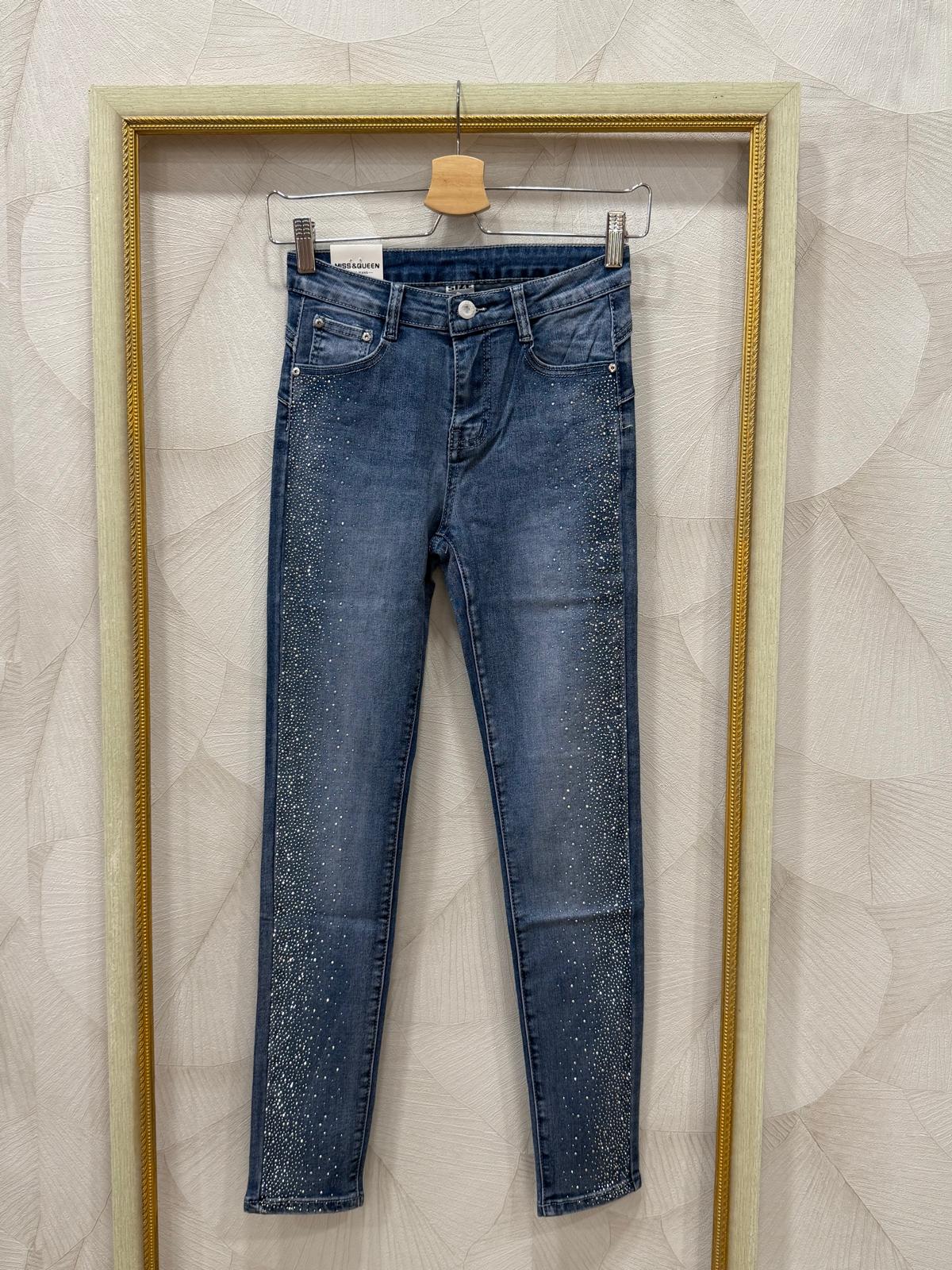 Luce un estilo brillante y atrevido con estos jeans con detalles de brillantes a lo largo de todos los laterales, de arriba a abajo.