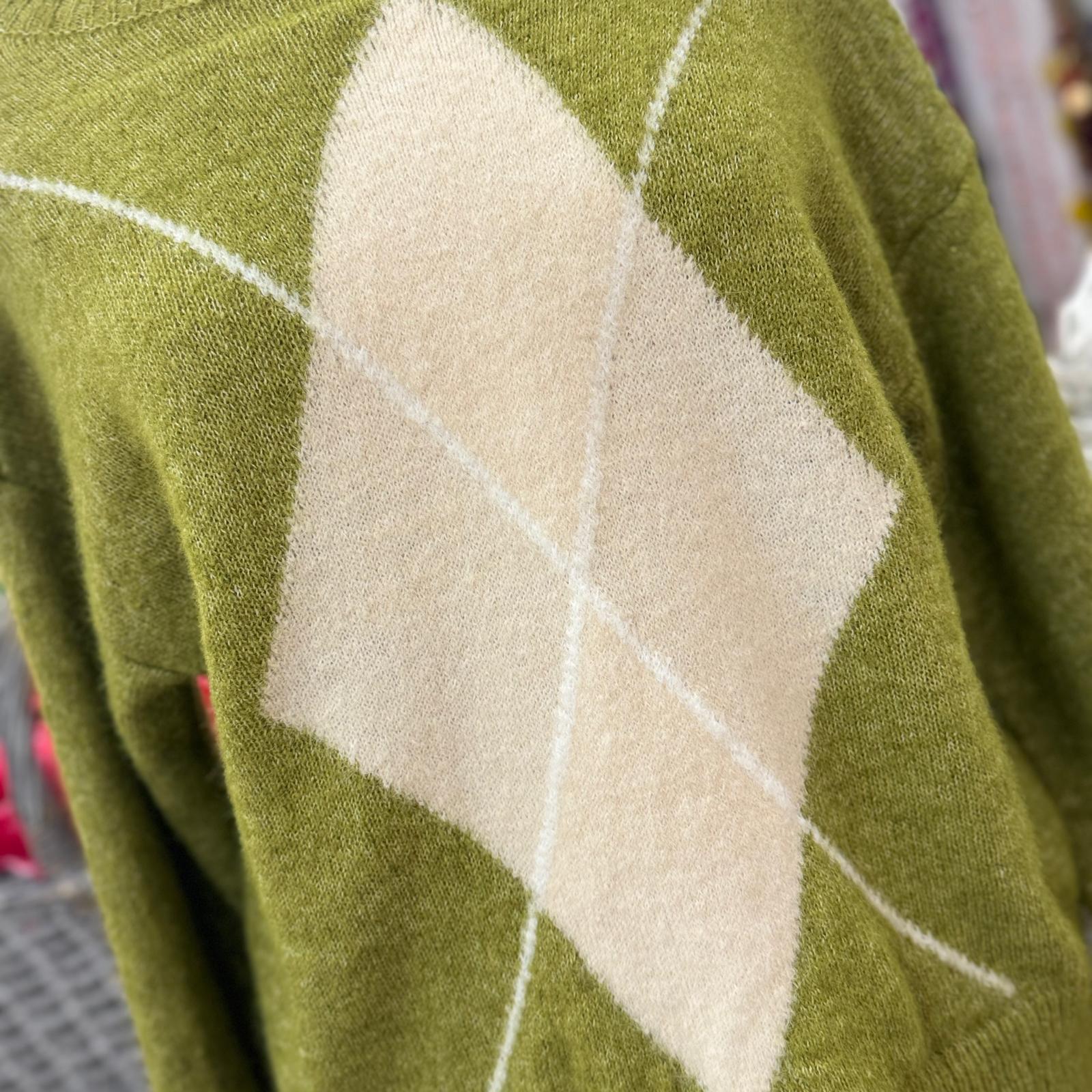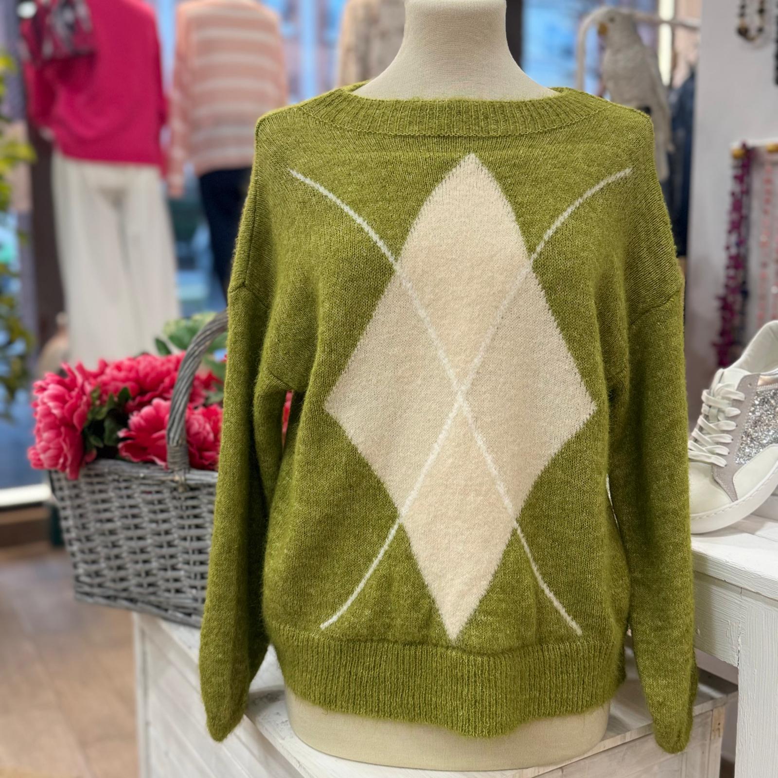 Jesey de tono pistacho con adornos cuadrados beige.
