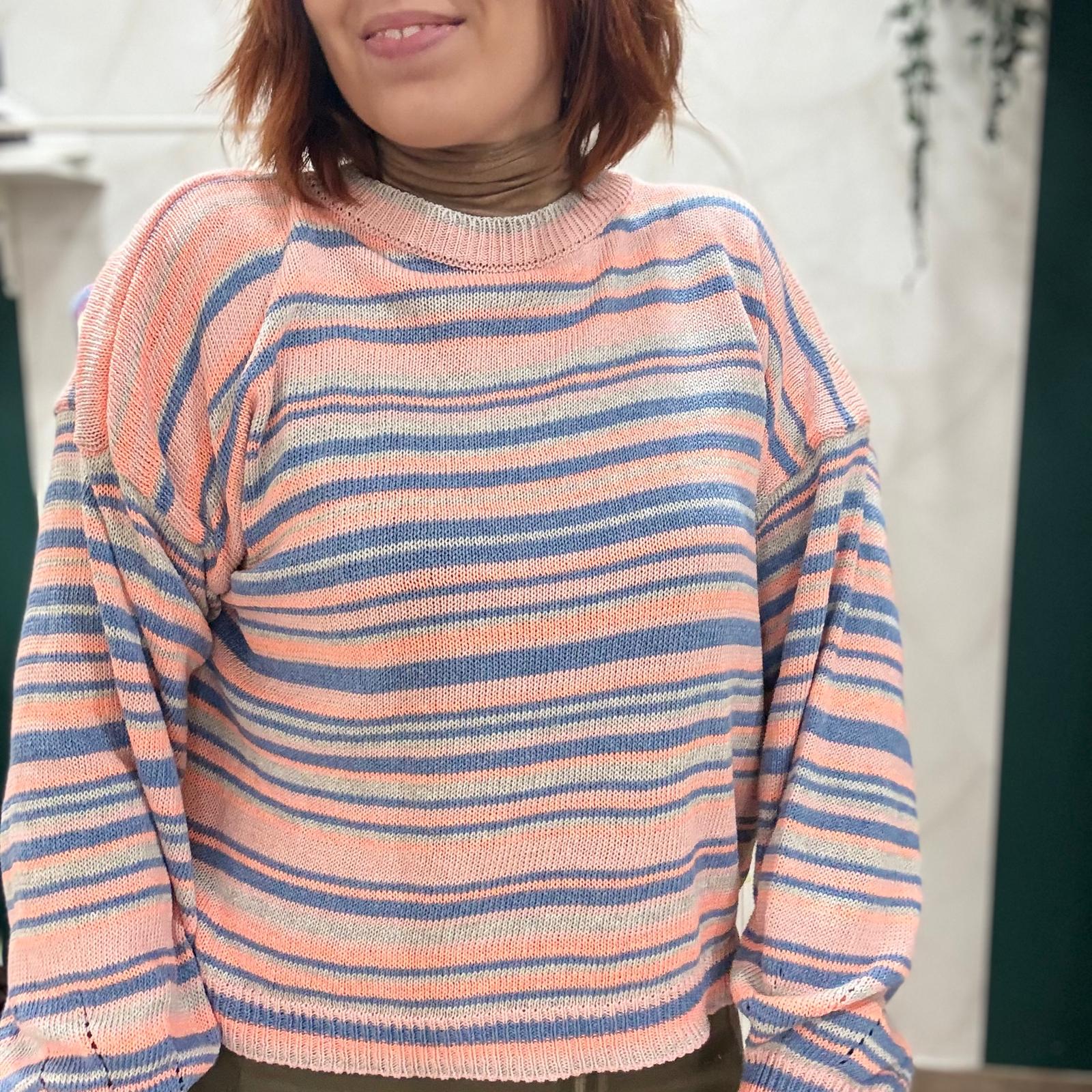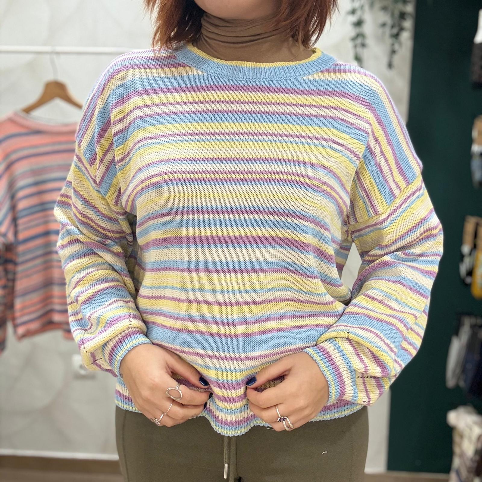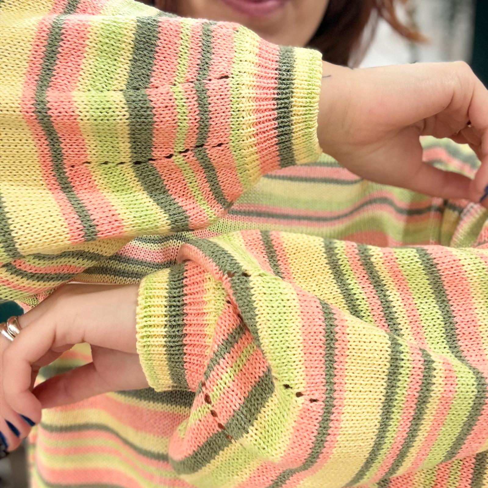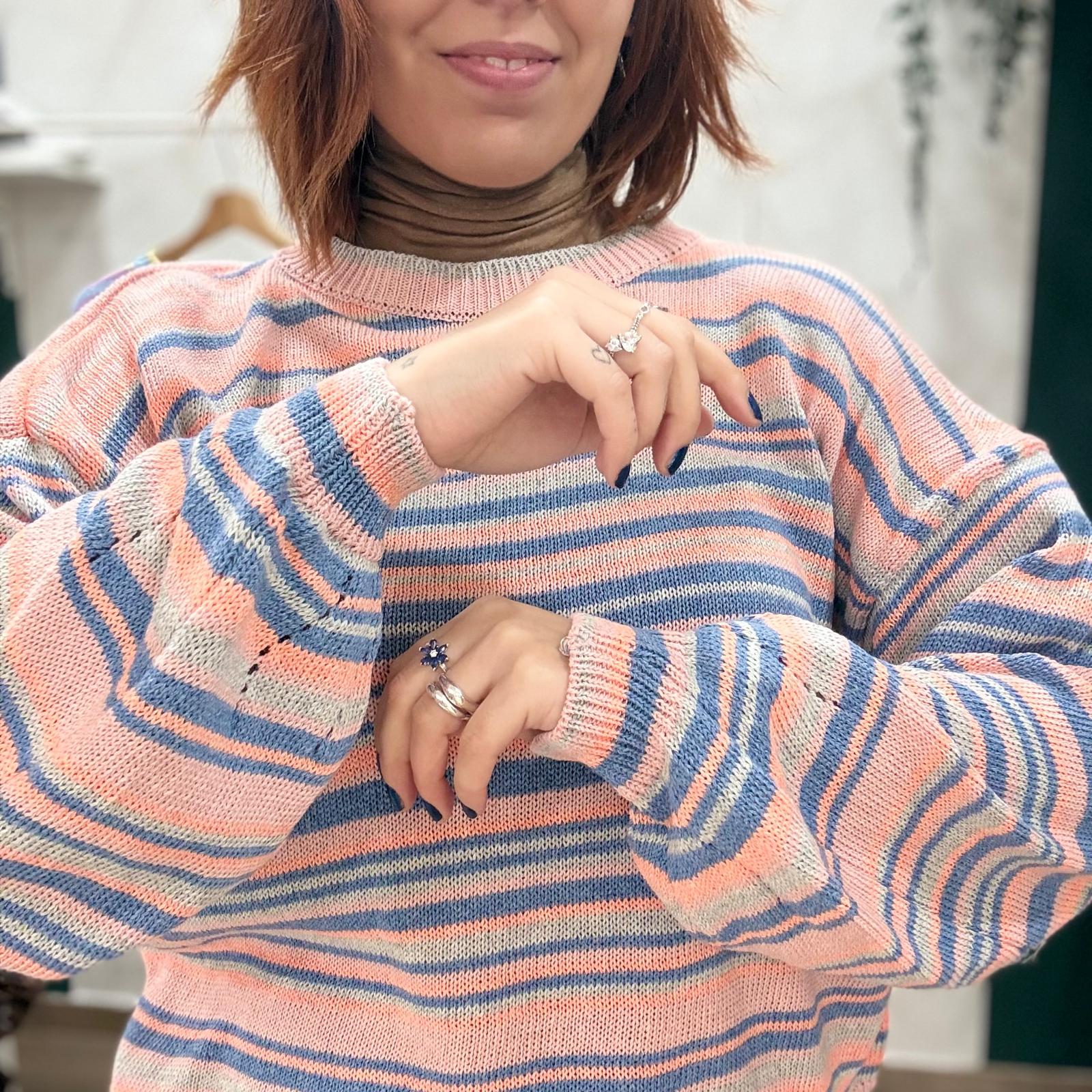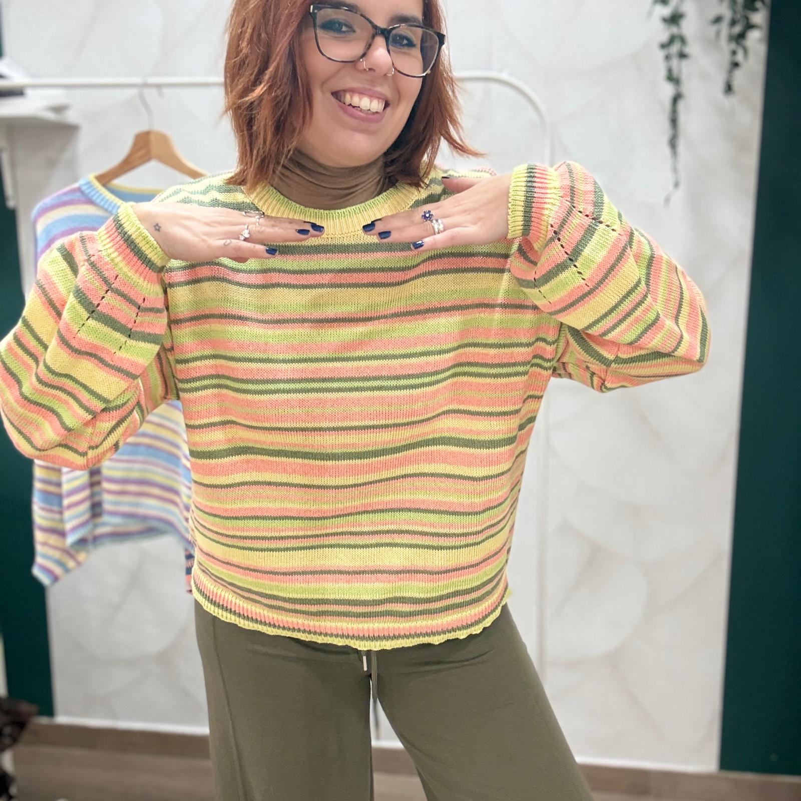 Jersey de punto fino en talla única, con diseño de rayas multicolor que aporta un toque alegre y actual a cualquier look. Su tejido es suave y ligero, ideal para entretiempo, y su corte holgado se adapta cómodamente a diferentes siluetas.