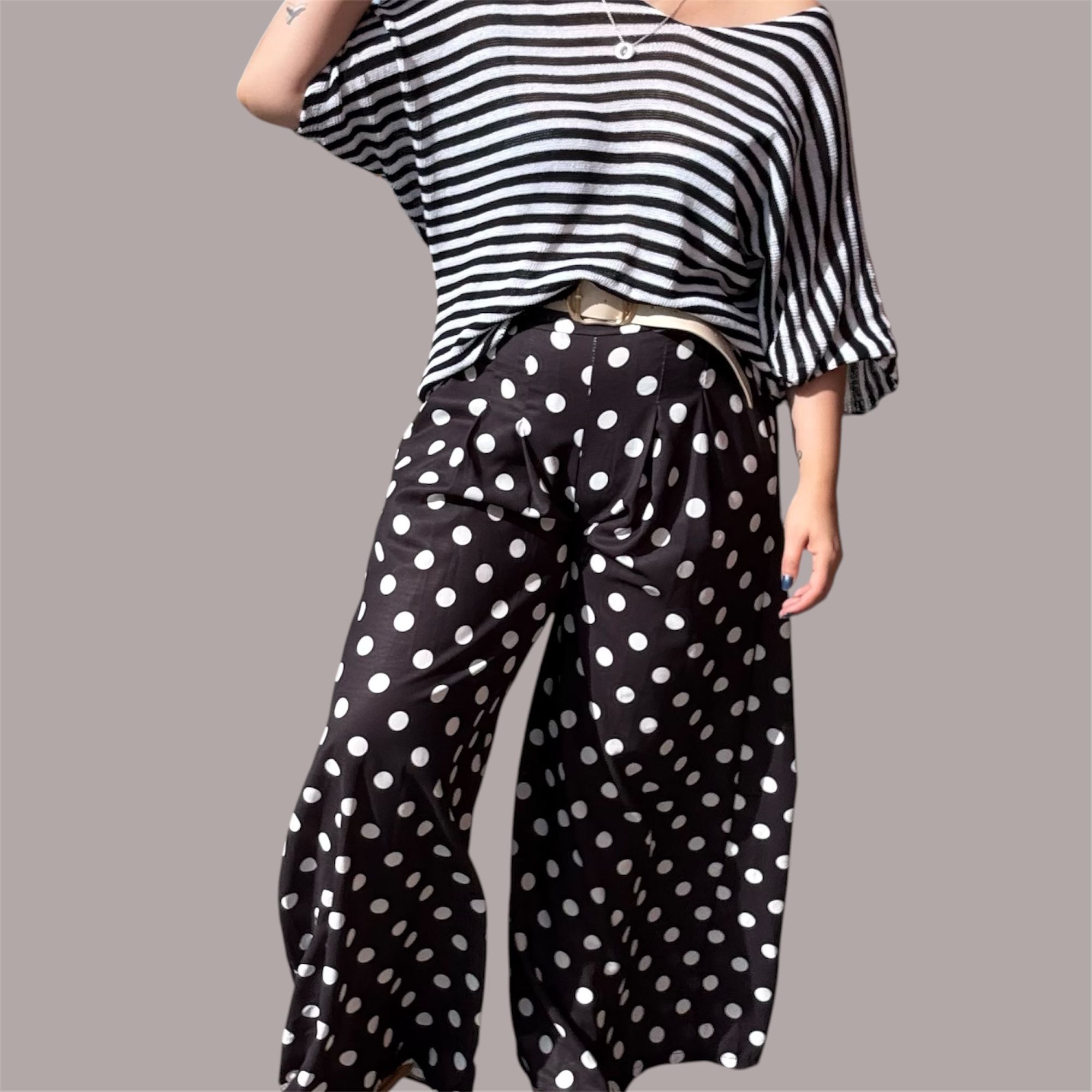 Pantalón ancho tipo palazzo en color negro con estampado de lunares blancos. Presenta un diseño de tiro alto con cintura elástica que se adapta cómodamente al cuerpo, ideal como talla única (aproximadamente hasta una 44).
