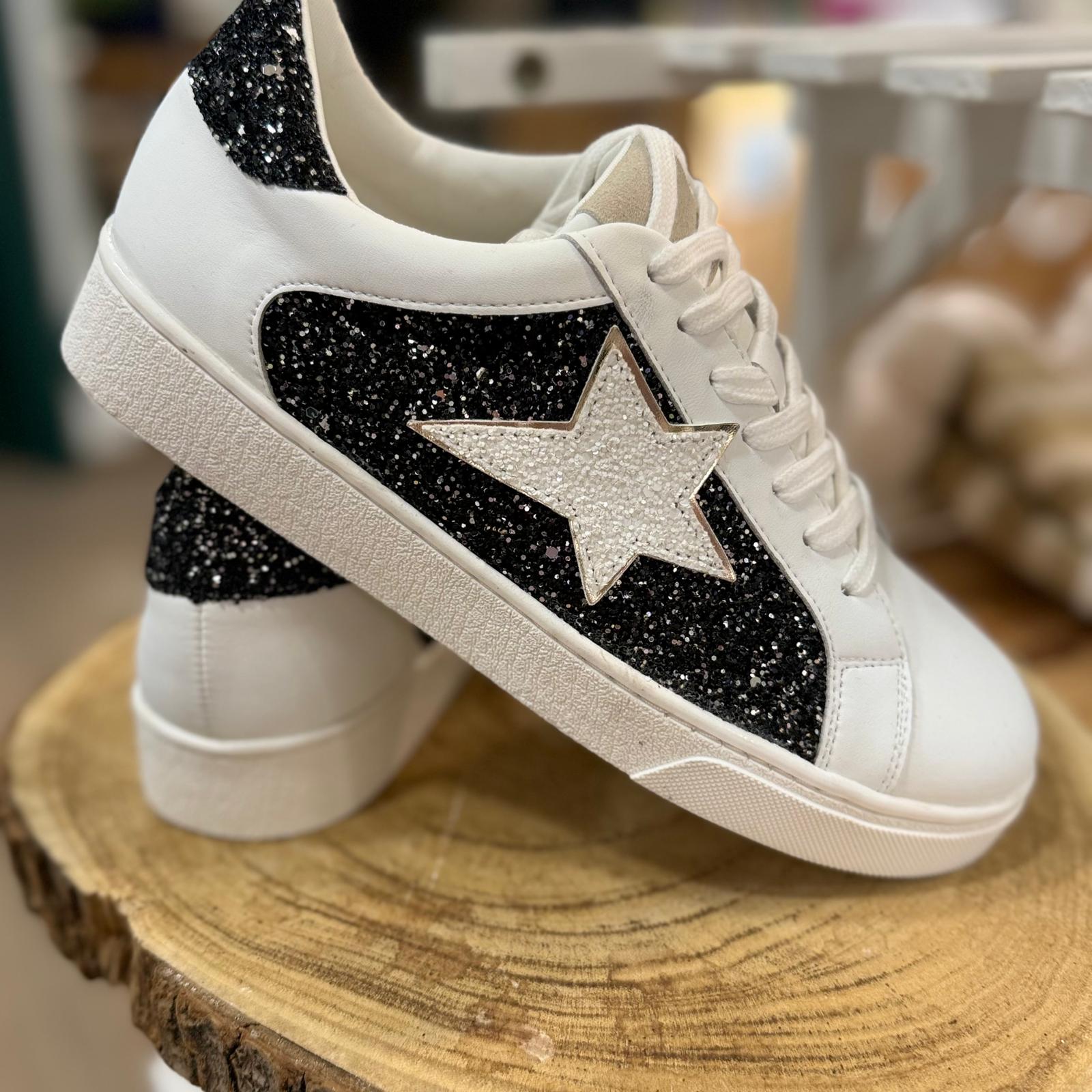 Playeras estrella en fondo blanco con glitter negro y dibujo de estrella