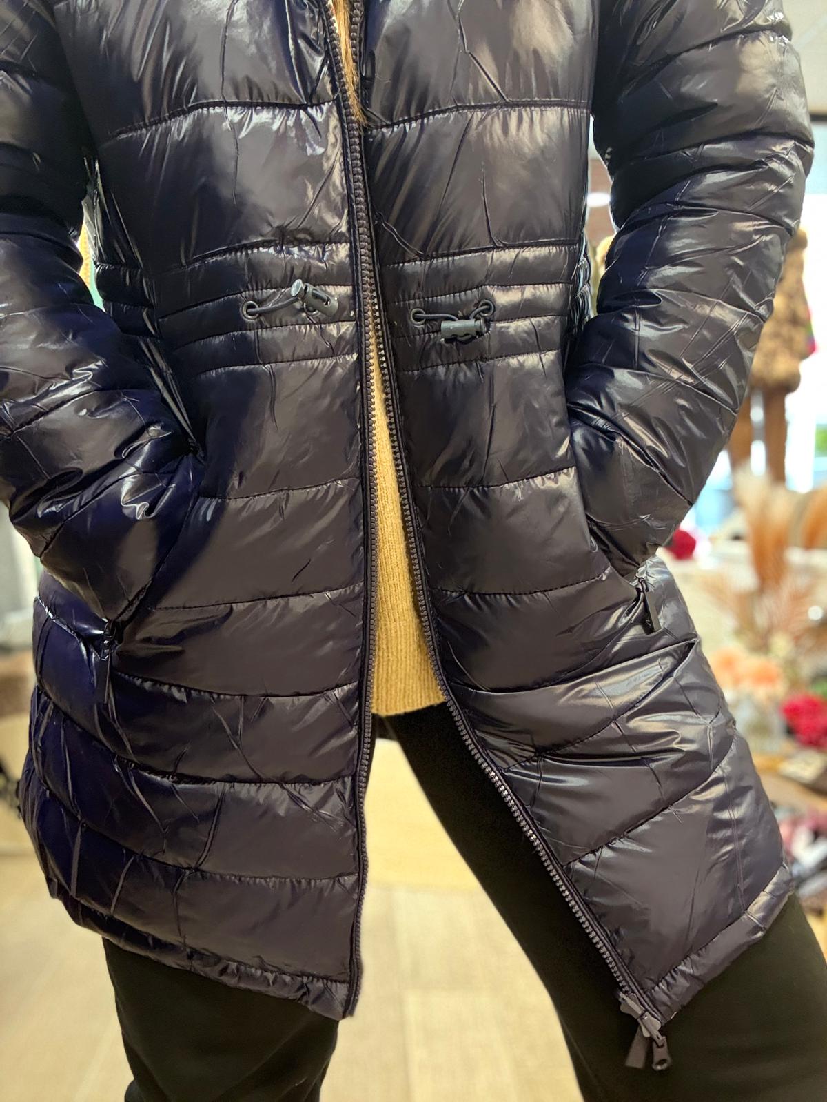 Plumífero ligero azul marino brillante reversible. Al darlo la vuelta se convierte en un plumífero lleno de flores en tonalidades beige.