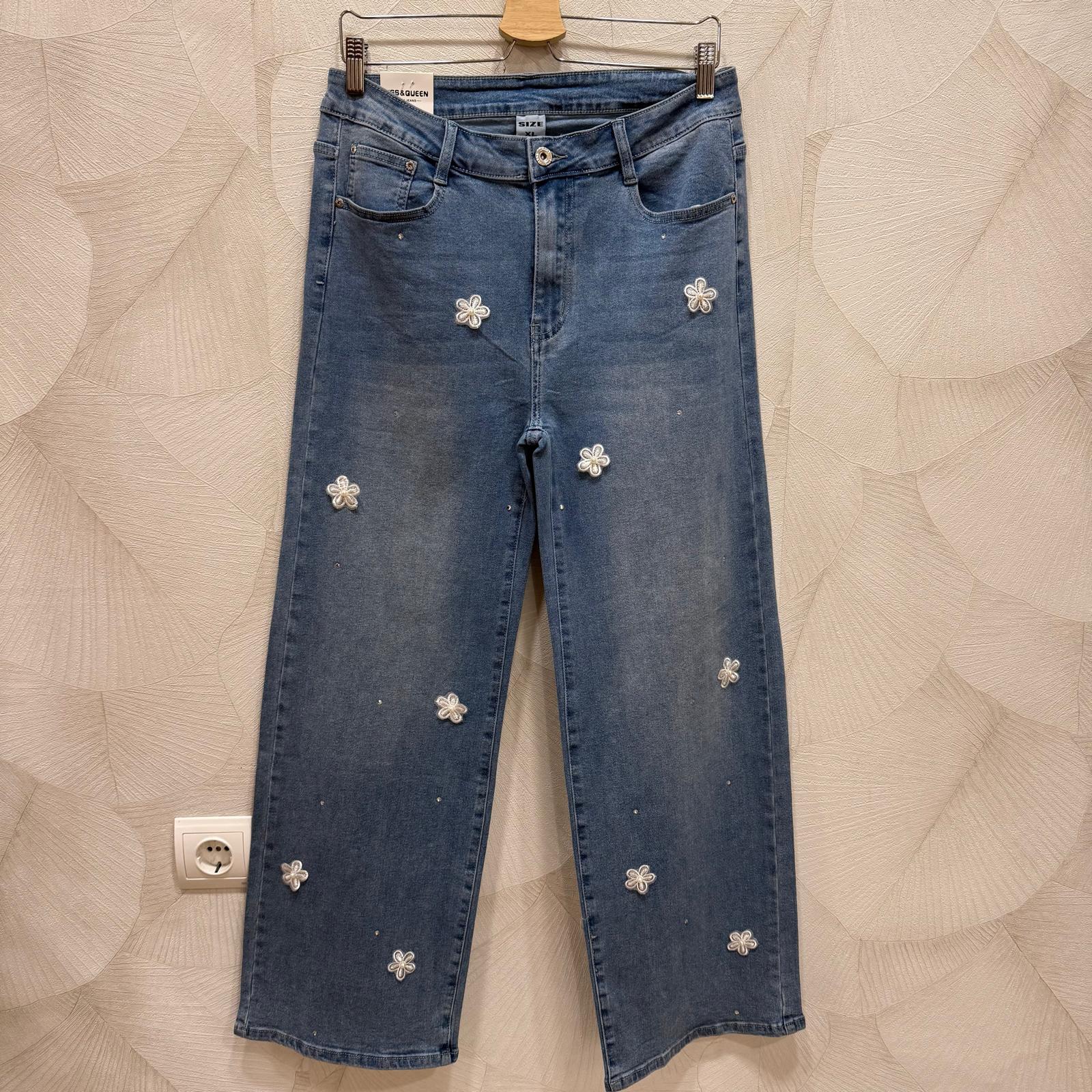 Vaqueros de corte recto en denim azul lavado, con un diseño original de flores bordadas que aportan un toque femenino y diferente.